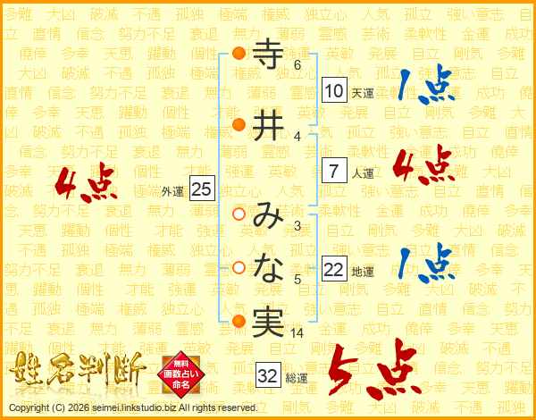 生活面を象徴する運勢です。外部から受ける影響力を表し、結婚運、家庭運や職場、環境への順応性を表します。総運から人運を引いた画数。姓や名が1文字の場合を除く。