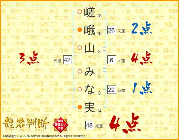 嵯(13画)峨(10画)山(3画) み(3画)な(5画)実(14画)