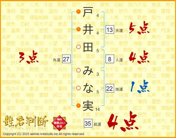 戸(4画)井(4画)田(5画) み(3画)な(5画)実(14画)