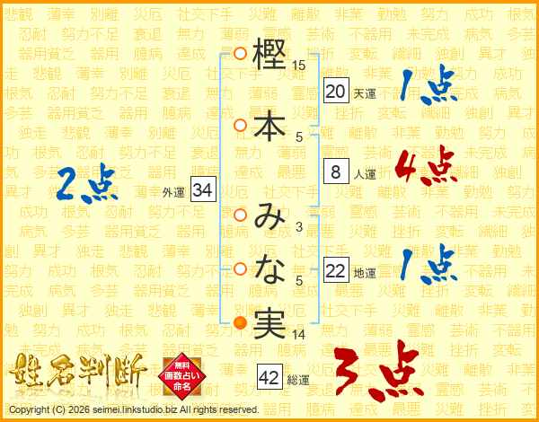 樫(15画)本(5画) み(3画)な(5画)実(14画)