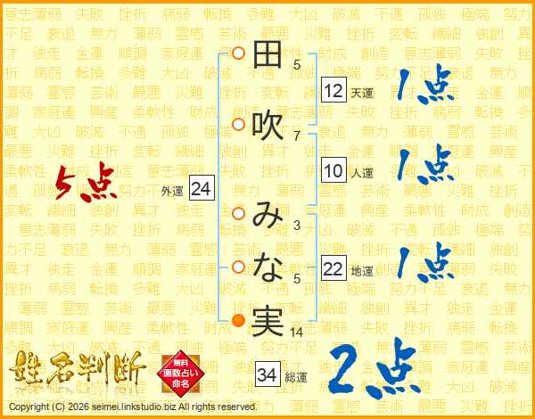 田(5画)吹(7画) み(3画)な(5画)実(14画)