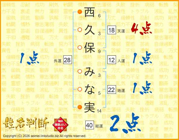 西(6画)久(3画)保(9画) み(3画)な(5画)実(14画)