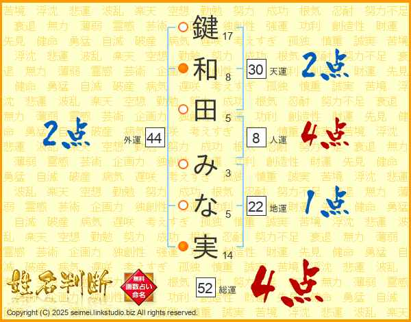 鍵(17画)和(8画)田(5画) み(3画)な(5画)実(14画)