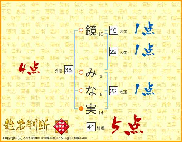 生活面を象徴する運勢です。外部から受ける影響力を表し、結婚運、家庭運や職場、環境への順応性を表します。総運から人運を引いた画数。姓や名が1文字の場合を除く。