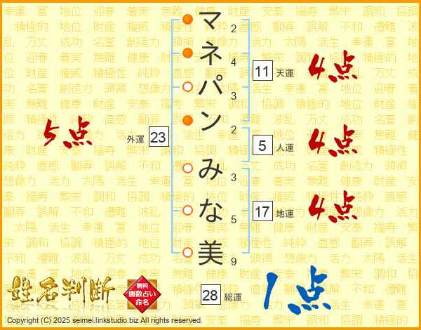 マ(2画)ネ(4画)パ(3画)ン(2画) み(3画)な(5画)美(9画)