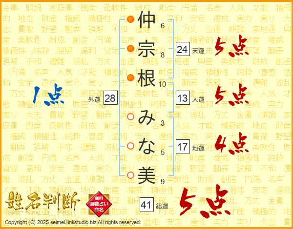 仲宗根みな美さんの総運は41画の5点!