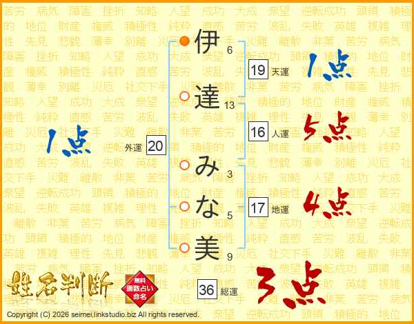 伊(6画)達(13画) み(3画)な(5画)美(9画)
