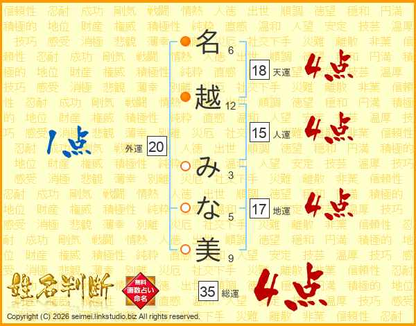 名(6画)越(12画) み(3画)な(5画)美(9画)