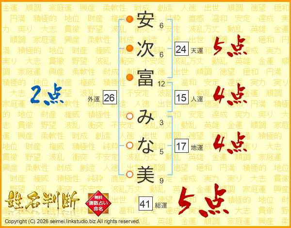 安(6画)次(6画)富(12画) み(3画)な(5画)美(9画)