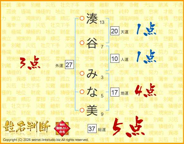 湊(13画)谷(7画) み(3画)な(5画)美(9画)