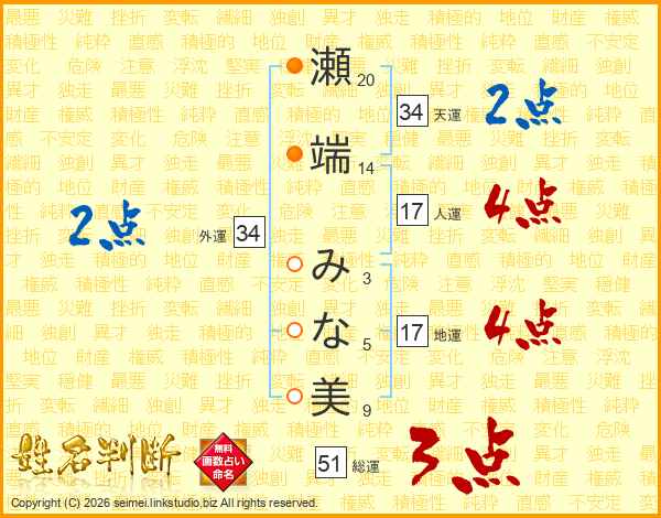 瀬(20画)端(14画) み(3画)な(5画)美(9画)