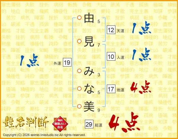 由(5画)見(7画) み(3画)な(5画)美(9画)