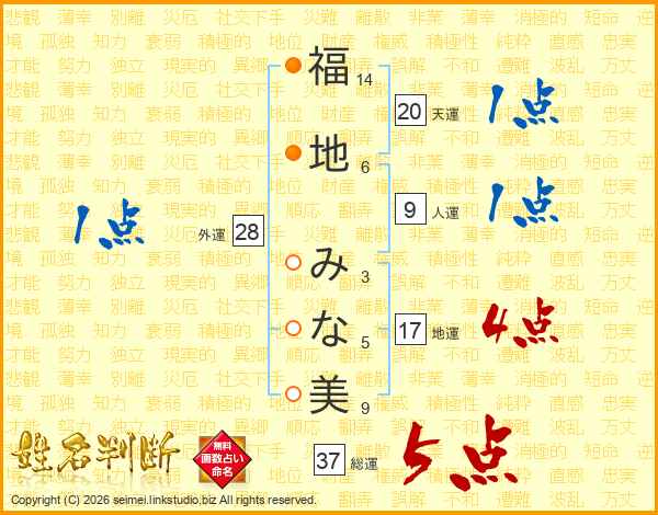 福(14画)地(6画) み(3画)な(5画)美(9画)