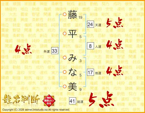 藤(19画)平(5画) み(3画)な(5画)美(9画)