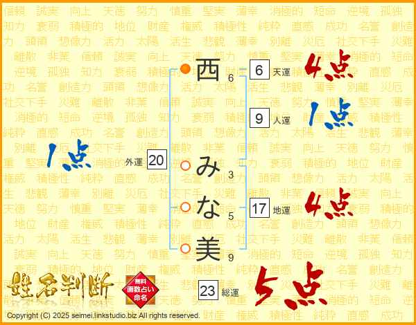 生活面を象徴する運勢です。外部から受ける影響力を表し、結婚運、家庭運や職場、環境への順応性を表します。総運から人運を引いた画数。姓や名が1文字の場合を除く。