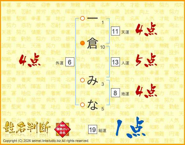 生活面を象徴する運勢です。外部から受ける影響力を表し、結婚運、家庭運や職場、環境への順応性を表します。総運から人運を引いた画数。姓や名が1文字の場合を除く。