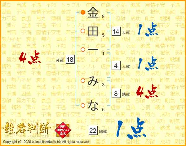 金(8画)田(5画)一(1画) み(3画)な(5画)