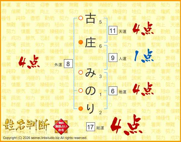 古(5画)庄(6画) み(3画)の(1画)り(2画)