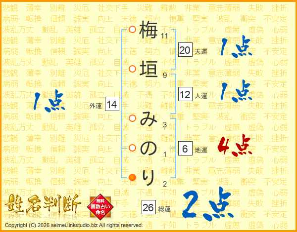 梅垣みのりさんの総運は26画の2点!