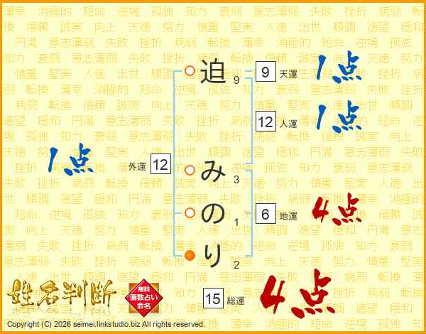 生活面を象徴する運勢です。外部から受ける影響力を表し、結婚運、家庭運や職場、環境への順応性を表します。総運から人運を引いた画数。姓や名が1文字の場合を除く。