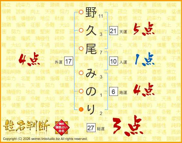 生活面を象徴する運勢です。外部から受ける影響力を表し、結婚運、家庭運や職場、環境への順応性を表します。総運から人運を引いた画数。姓や名が1文字の場合を除く。
