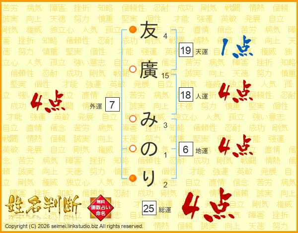 友廣みのりさんの総運は25画の4点!
