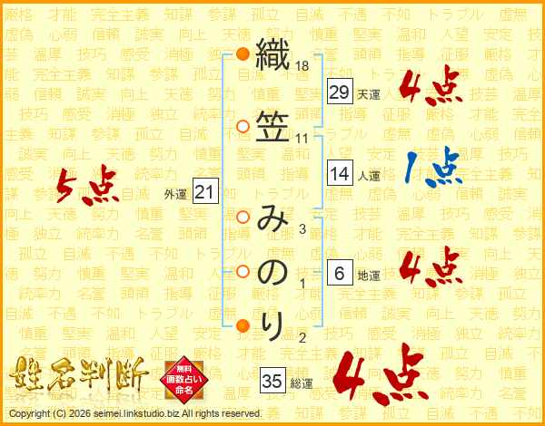 織(18画)笠(11画) み(3画)の(1画)り(2画)