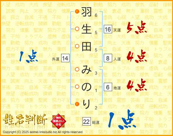 羽(6画)生(5画)田(5画) み(3画)の(1画)り(2画)