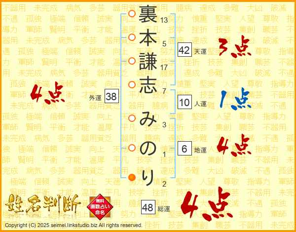 裏(13画)本(5画)謙(17画)志(7画) み(3画)の(1画)り(2画)