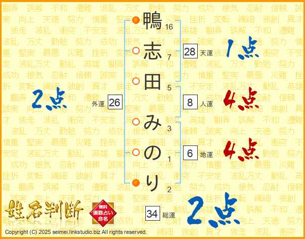 生活面を象徴する運勢です。外部から受ける影響力を表し、結婚運、家庭運や職場、環境への順応性を表します。総運から人運を引いた画数。姓や名が1文字の場合を除く。