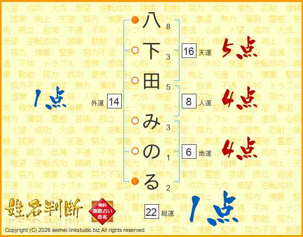 八下田みのるさんの総運は22画の1点!