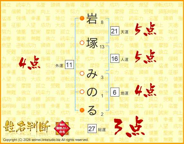 岩(8画)塚(13画) み(3画)の(1画)る(2画)