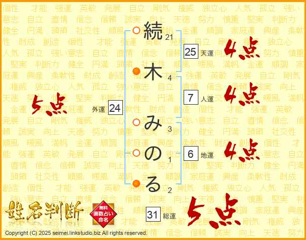 生活面を象徴する運勢です。外部から受ける影響力を表し、結婚運、家庭運や職場、環境への順応性を表します。総運から人運を引いた画数。姓や名が1文字の場合を除く。