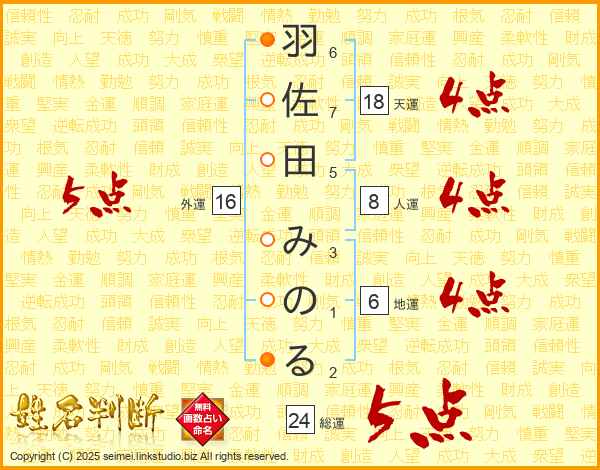 羽(6画)佐(7画)田(5画) み(3画)の(1画)る(2画)