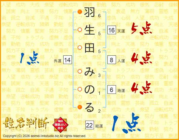 羽(6画)生(5画)田(5画) み(3画)の(1画)る(2画)