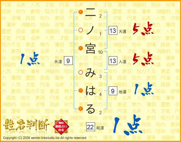 二ノ宮みはるさんの天運は13画の5点!
