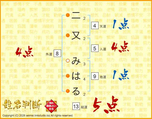 生活面を象徴する運勢です。外部から受ける影響力を表し、結婚運、家庭運や職場、環境への順応性を表します。総運から人運を引いた画数。姓や名が1文字の場合を除く。