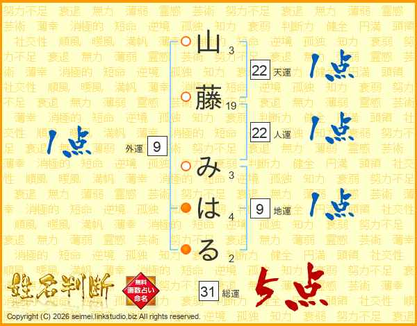 生活面を象徴する運勢です。外部から受ける影響力を表し、結婚運、家庭運や職場、環境への順応性を表します。総運から人運を引いた画数。姓や名が1文字の場合を除く。