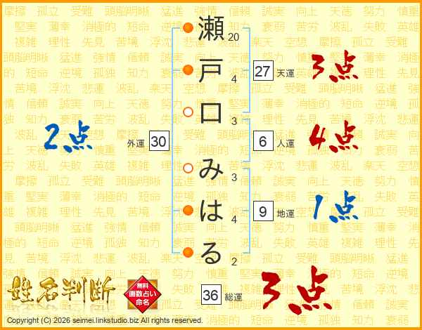 瀬戸口みはるさんの総運は36画の3点!