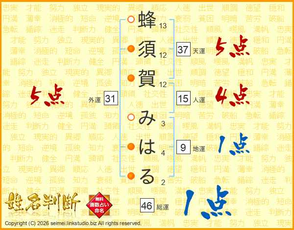 蜂(13画)須(12画)賀(12画) み(3画)は(4画)る(2画)