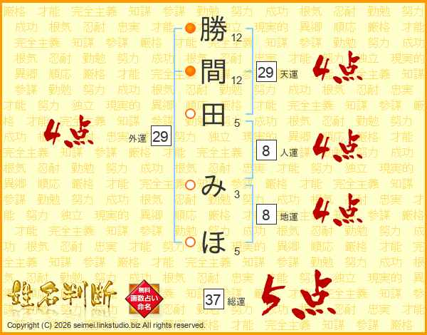 勝(12画)間(12画)田(5画) み(3画)ほ(5画)
