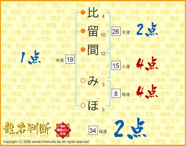 画数の奇数(○陽)と偶数(●陰)の配列で吉凶を占います。どちらかにかたよる名前は大凶名で避ける必要があります。画数の奇数偶数。