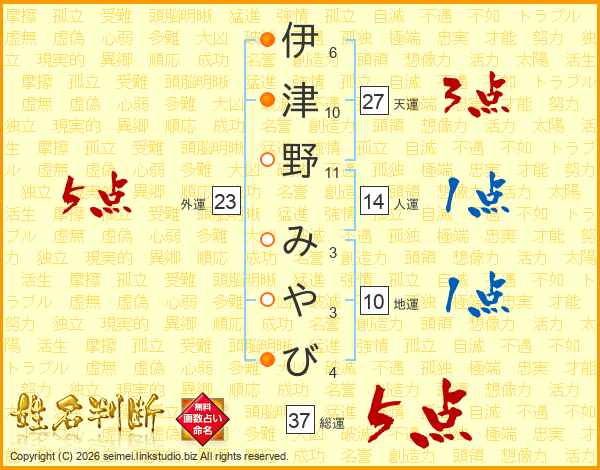 伊(6画)津(10画)野(11画) み(3画)や(3画)び(4画)