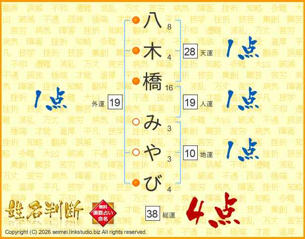 八(8画)木(4画)橋(16画) み(3画)や(3画)び(4画)