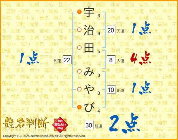 宇(6画)治(9画)田(5画) み(3画)や(3画)び(4画)