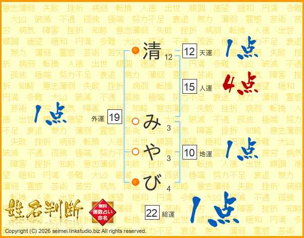 生活面を象徴する運勢です。外部から受ける影響力を表し、結婚運、家庭運や職場、環境への順応性を表します。総運から人運を引いた画数。姓や名が1文字の場合を除く。