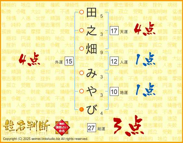 田(5画)之(3画)畑(9画) み(3画)や(3画)び(4画)