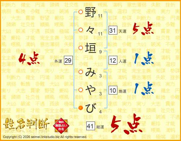 野(11画)々(11画)垣(9画) み(3画)や(3画)び(4画)