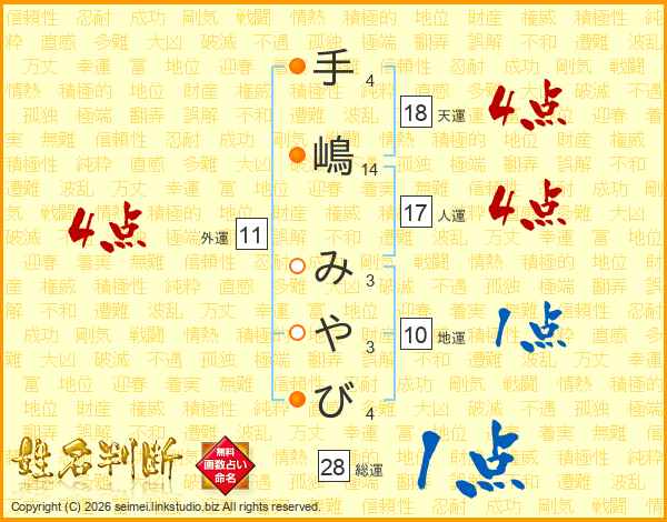 手(4画)嶋(14画) み(3画)や(3画)び(4画)
