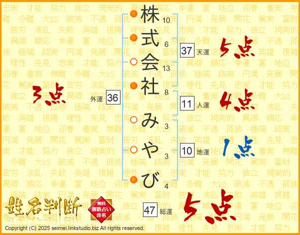 株(10画)式(6画)会(13画)社(8画) み(3画)や(3画)び(4画)